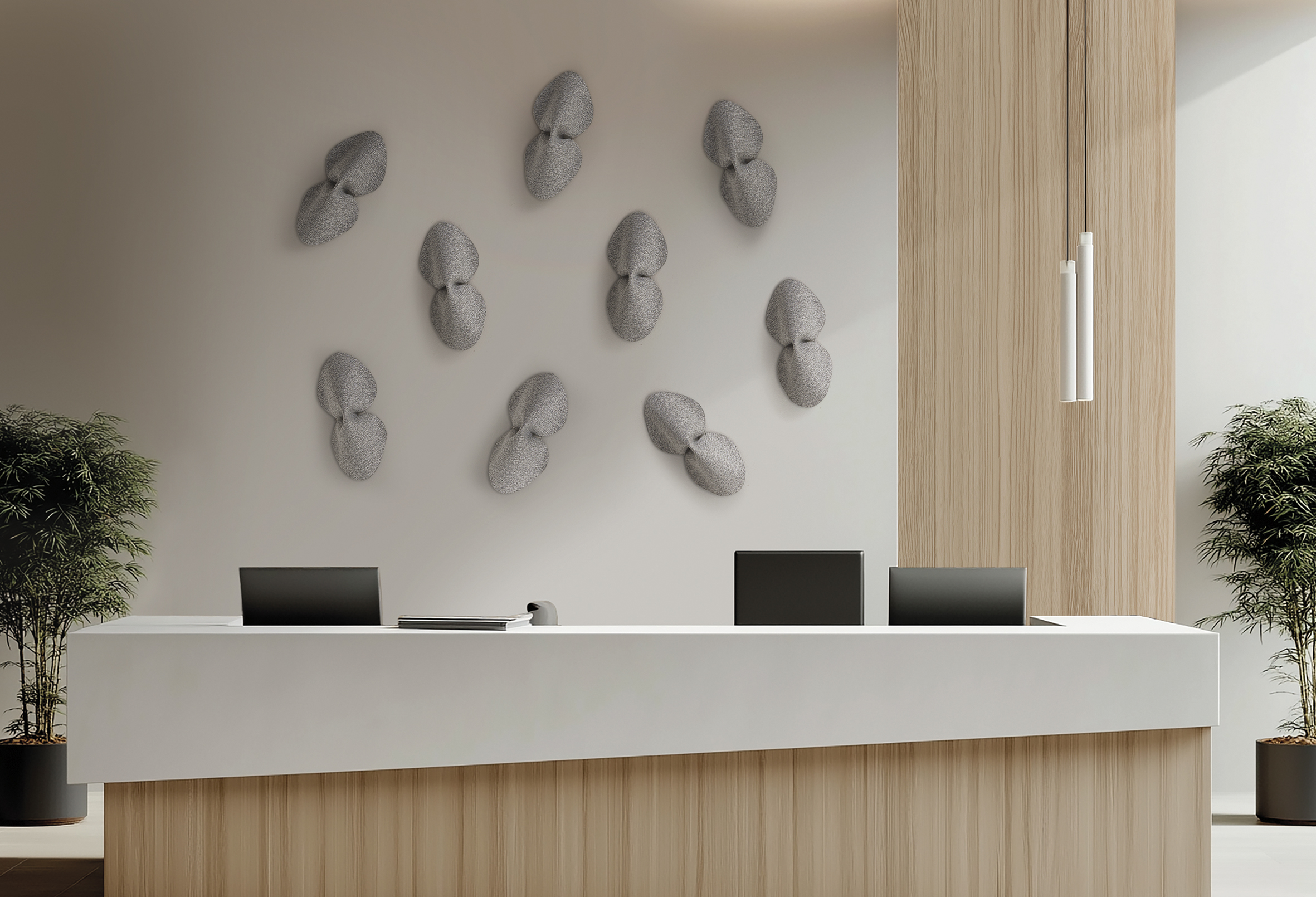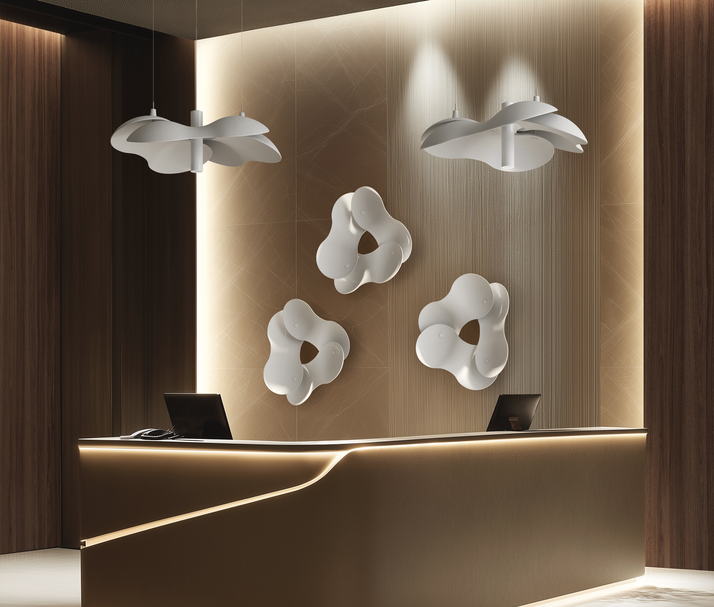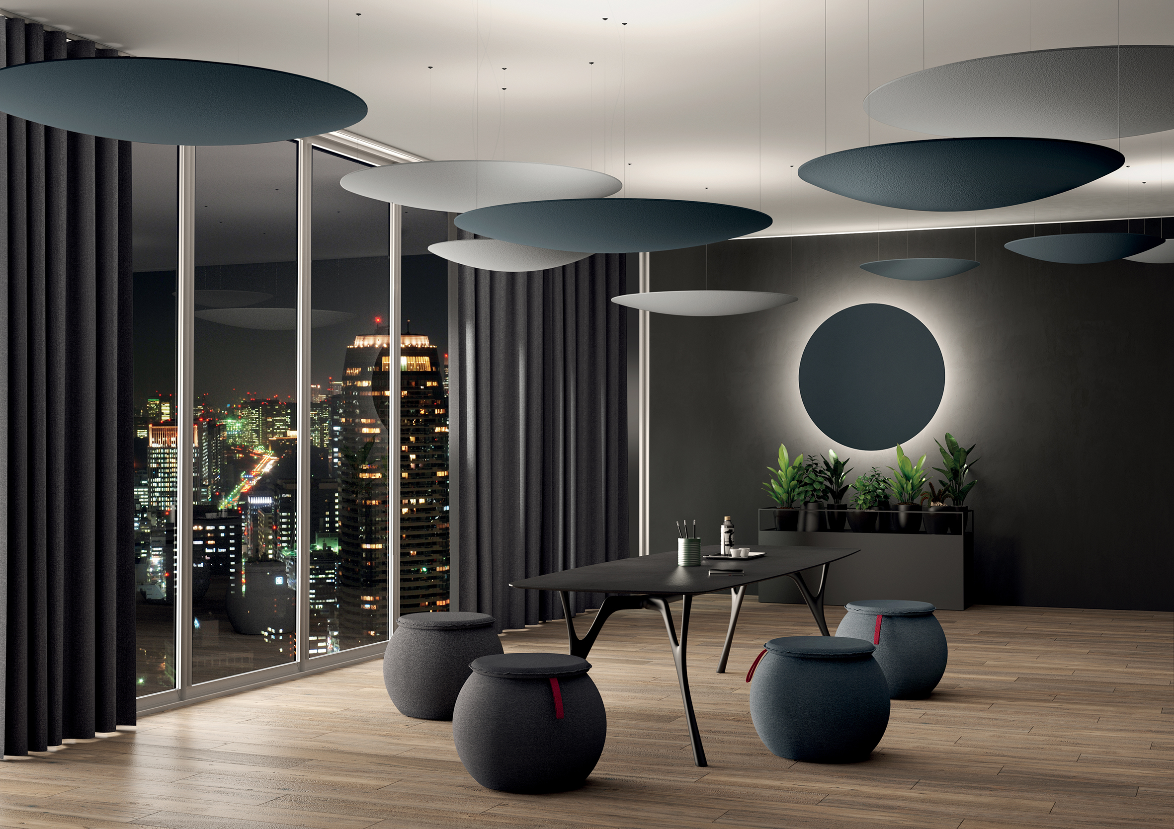 Superfici tessili, pannelli, arredi e soluzioni integrate dialogano con luce e materia per restituire equilibrio allo spazio.