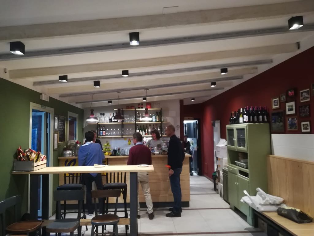 La sala è stata decorata con faretti a soffitto Wever & Ducrè per donare una luce omogenea e calda, con un tocco di industrial al bancone con Toscot Torino.
